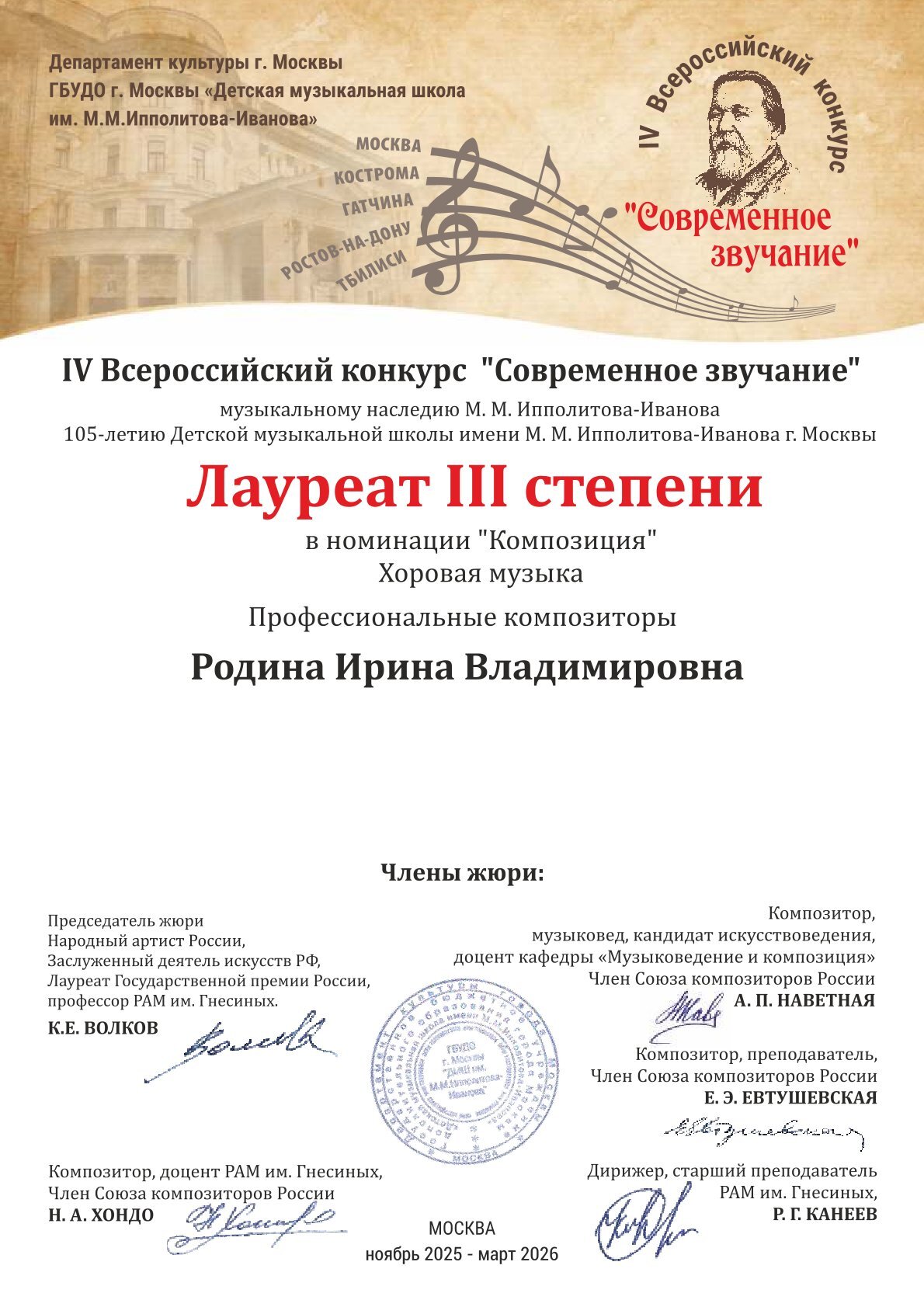 Награждение и гала-концерт состоялись 17 марта 2026 г. в Государственном музыкально-педагогическом институте имени М. М. Ипполитова-Иванова (ГМПИ) — это одно из ведущих музыкальных учебных заведений Москвы. В нем приняли участие члены правления Союза композиторов России, ведущие преподаватели Московской консерватории и Академии им. Гнесиных, оркестр русских народных инструментов ГМПИ им. М. М. Ипполитова-Иванова.